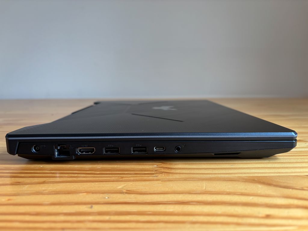 O ASUS TUF Gaming A15 oferece três portas USB-A Gen 3.2, uma porta USB-C 3.2 com suporte a DisplayPort, HDMI 2.1, conector de áudio de 3,5 mm e uma porta RJ45. Ou seja, ele supre bem a demanda por dongles diferentes para mouse e fone, por exemplo.