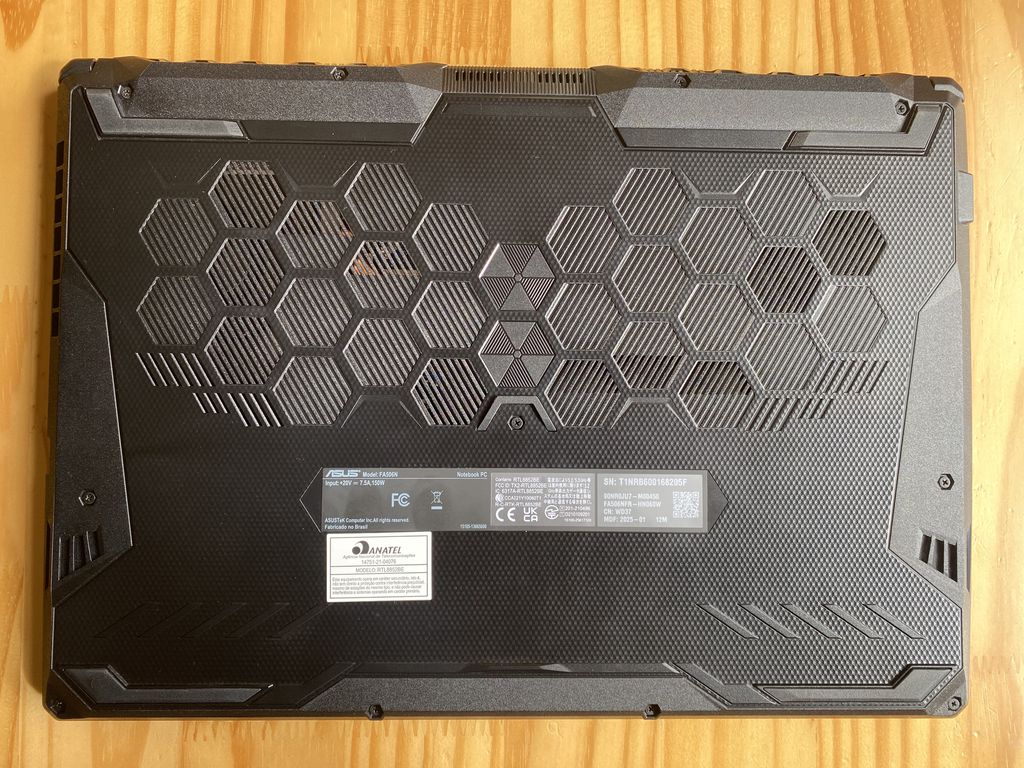 Na parte inferior, o modelo tem parte do corpo desenhado como se fosse uma colmeia, região que serve para entrada de ar, mas nem toda a colmeia é furada, algo que acaba limitando o fluxo de ar para refrigerar o notebook. Em relação à iluminação, temos o teclado retroiluminado com LED, com diferentes modos configuráveis pelo próprio teclado ou pelo app Armoury Crate da ASUS.