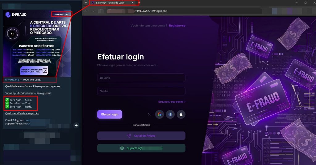 Chamada “E-Fraud”, a plataforma opera a partir de um servidor cujo IP está localizado nos Estados Unidos e funciona como um hub de crime digital. Entre os serviços oferecidos, o principal é a verificação de cartões que foram obtidos de maneira ilegal.