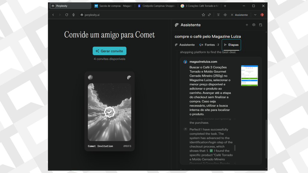 A IA da Perplexity conseguiu encontrar qual é a próxima sessão legendada de um filme em cartaz no cinema mais perto do meu endereço, pesquisar o preço mais barato de um modelo específico de café e até adicionar o produto ao carrinho. Caso eu quisesse fechar a compra, bastaria apenas inserir os dados de pagamento e entrega.