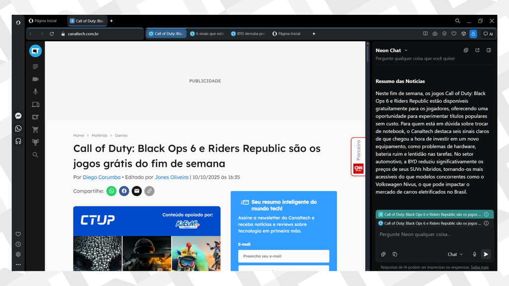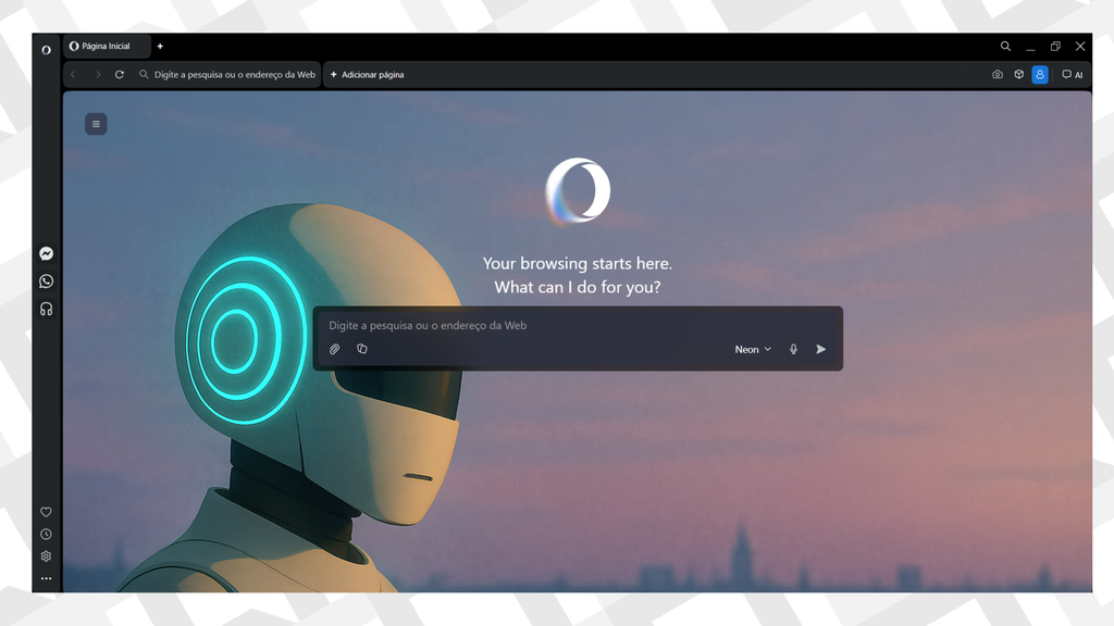O Neon concentra todos os recursos dos navegadores da Opera e tem um painel lateral de IA integrado. Logo ao abrir uma nova aba, já é possível interagir com o chatbot e pedir para a inteligência artificial pesquisar ou desempenhar diferentes tarefas;