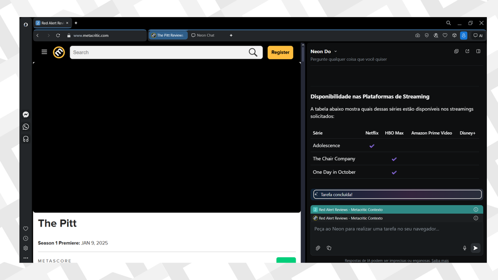 Usar o agente Do é mais demorado por todo o processo de pesquisa entre sites e abas abertas. No primeiro caso, pedi para o assistente encontrar as séries lançadas em 2025 com maior nota no Metacritic e listar quais opções estão disponíveis nos streamings que assino — o navegador trouxe todas as informações de forma clara e resumida.