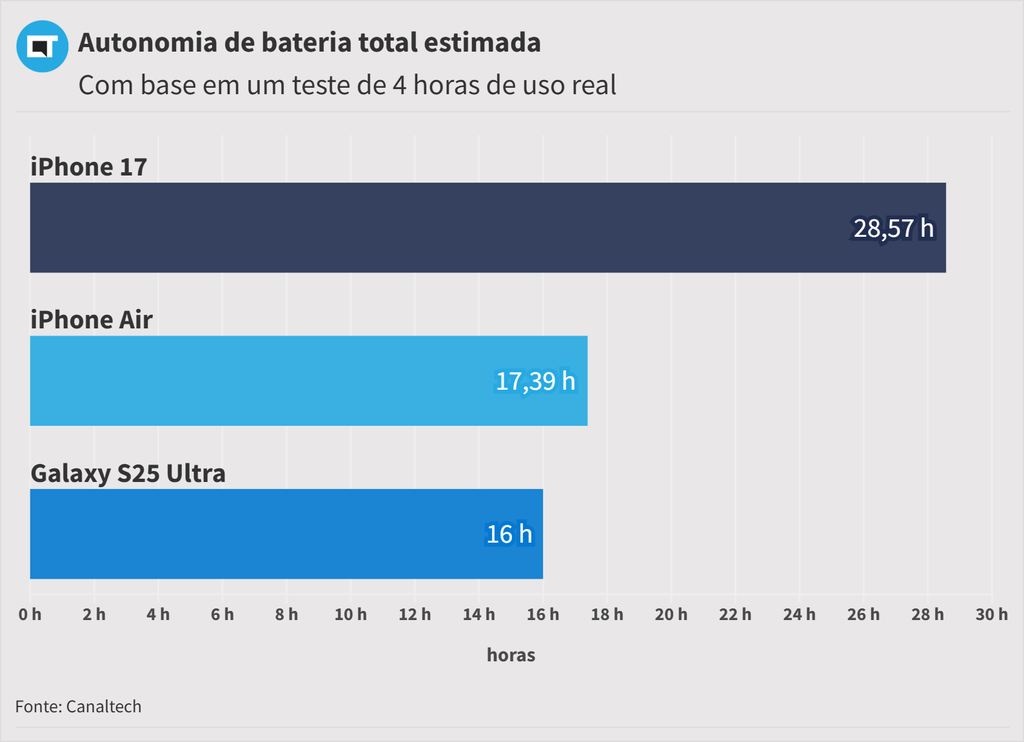 O nosso teste de bateria padrão confirma essa impressão. No teste, o iPhone Air consumiu 23% da carga em um período de 4 horas. Neste cenário, estima-se que sua bateria dure aproximadamente 17 horas.