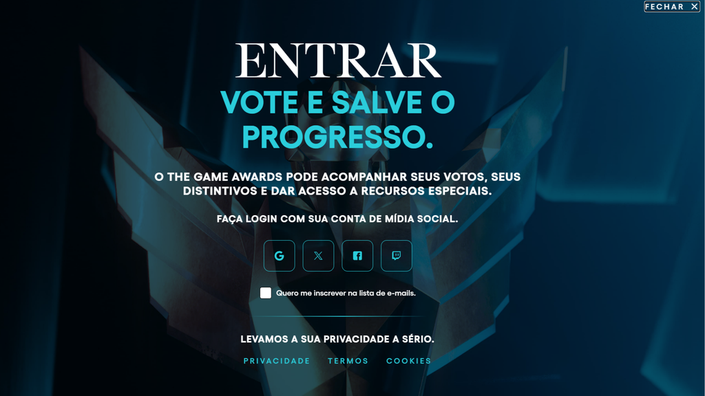 O segundo passo é se cadastrar ou entrar com uma conta no site do The Game Awards. Para isso, é necessário vincular um e-mail ou conta de rede social no site (Google, X, Facebook ou Twitch).