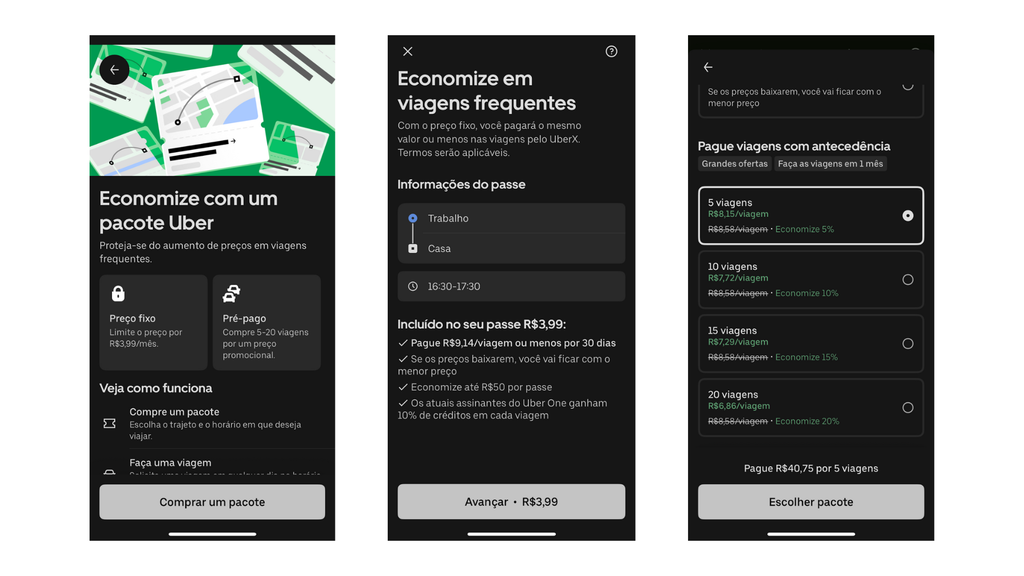 Para ativar, é necessário pagar uma taxa de R$ 3,99. O valor pode ser usado por 30 dias ou até o desconto total atingir R$ 50, desde que o cliente peça sempre com o mesmo horário e trajeto. Quando o valor da corrida estiver abaixo do preço fixado, o app vai selecionar a opção mais barata.