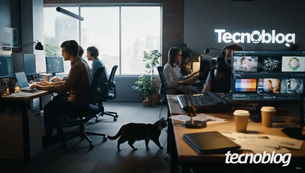 Não dá para dizer que a ferramenta é perfeita, no entanto. Eu testei e, em um dos prompts, pedi para criar uma redação do Tecnoblog, com um gato andando pelos corredores. O Veo gerou uma imagem com o rabo na cabeça do coitado.