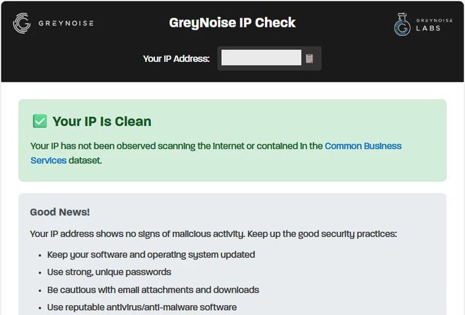 A ferramenta da GreyNoise é bastante simples, indo direto ao ponto para dizer ao usuário se o endereço de IP dele foi comprometido ou não. São três resultados possíveis: